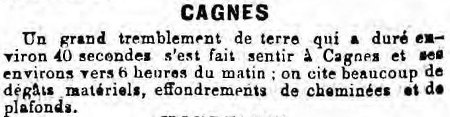 – 11 mars 1887 : réplique du séisme Ligure – largement ressentie à Cagnes - intensité maximale IMAX VI-VII