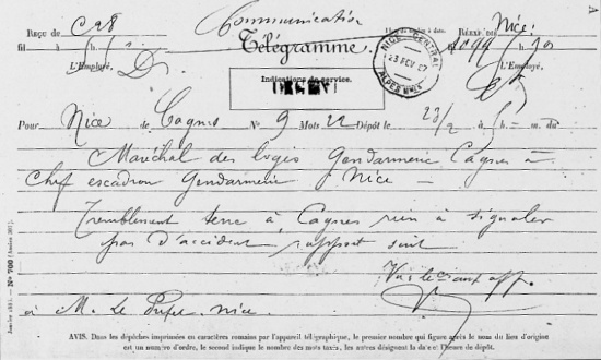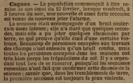 – 24 février 1887 : réplique du séisme ligure - faiblement ressentie à Cagnes - intensité maximale IMAX V