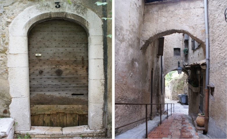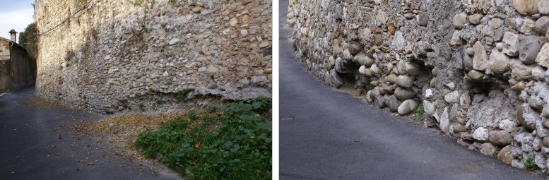 Les maisons sont constituées par des murs en maçonnerie de qualité médiocre. Ils sont réalisés en moellons (gros galets provenant des poudingues), des matériaux extraits donc du site, comme dans la plupart des villages du département. Cela, explique d’ailleurs, la grande intégration des bâtiments anciens avec leur environnement proche, sur le plan des matériaux et des couleurs. Les pierres ne sont pas taillées et assemblées avec un enduit de chaux. On relève peu d’éléments de confortement (contreforts, arcs de contraste...) angles de bâtiments en pierre taillée.