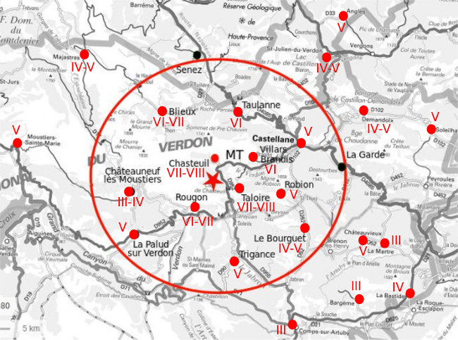 Dans le département du Var : à Bargemon, Baudinard-sur-Verdon, Bauduen, Châteauvieux, Soleils et Trigance. Intensité V (MSK). [1]