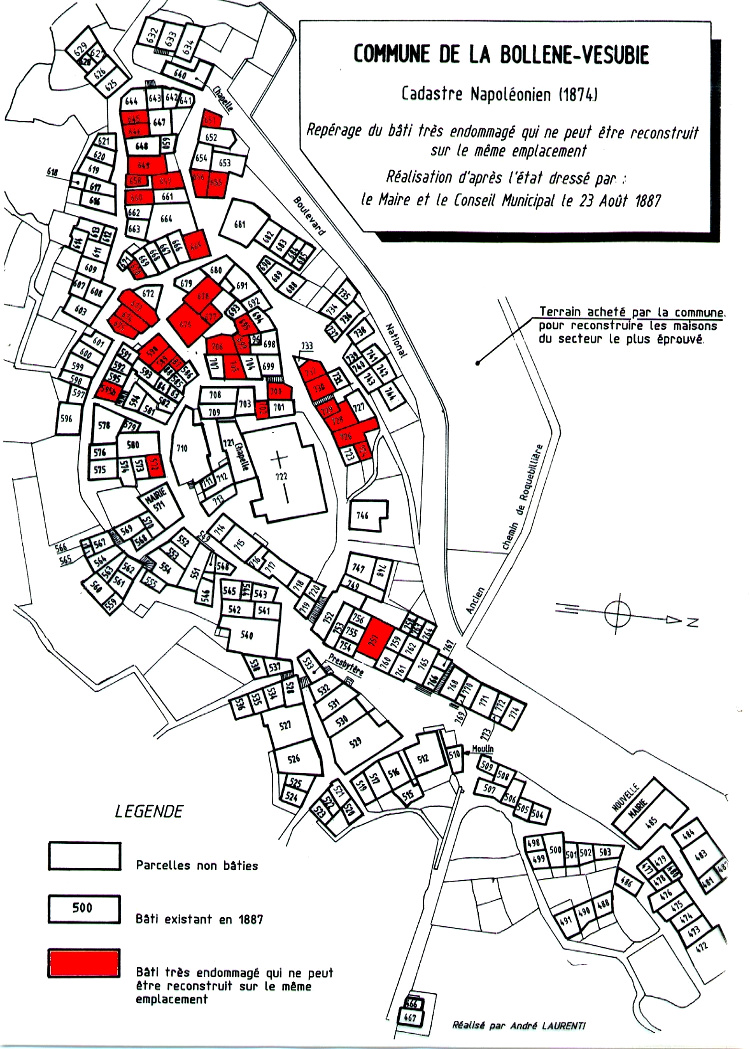 Si l’on compare le cadastre de 1874 à l’actuel, on s’aperçoit que de nombreuses constructions ont disparu à l’intérieur du village (voir plan). On a parfois profité des destructions liées au séisme pour élargir certaines rues, comme la rue Constant Cassini et la rue du Clape, ou encore pour aménager des terrasses privatives et des places publiques.