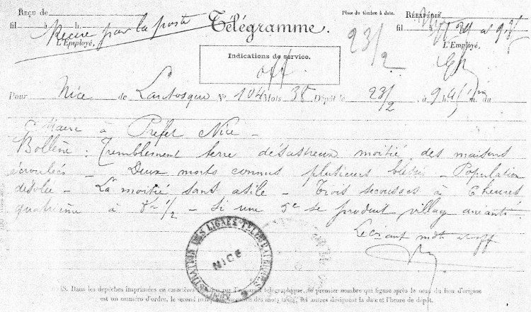 - Télégramme en date du 13 février 1887 - Réf. 1 M987 - Archives Départementales des Alpes Maritimes (ADAM)