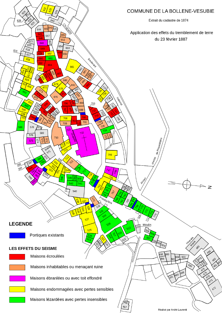 La découverte aux archives départementales d’une liste des propriétés affectées auxquelles étaient associées les numéros de parcelles et la description de la nature des dégâts, a permis de reporter ces informations sur le cadastre en vigueur de 1874 et mettre en lumière les effets du séisme sur le village. Le résultat obtenu est en parfait accord avec les déclarations de Gayraud qui distinguait deux parties, l’une fortement endommagée et l’autre moins touchée.