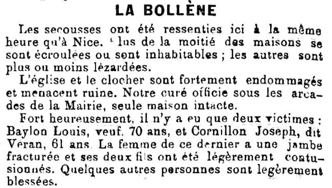 La coupole du clocher du village fortement endommagée ainsi que sa croix penchée, s’offrent d’abord à notre vue. Nous montons à la Bollène et nous entrons par une rue qui commence à la maison de Mme Thaon Peyrani et qui fait le tour complet du village. Près d’une chapelle dite de la Madonna des Nogairets et qui menace ruine, nous trouvons des paysans travaillant encore à rechercher des bestiaux ensevelis et des denrées perdues. Nous nous engageons à travers les rues qui n’existent plus. Une odeur de viande putréfiée vient frapper notre odorat. Le danger est trop grand pour que l’on puisse extraire des bêtes mortes sous ces nouvelles ruines. Le spectacle le plus désolant s’offre à nos yeux et nous marchons avec précaution. Des débris énormes de maisons écroulées, des maisons coupées en deux nous laissent voir deux ou trois étages ou des nombreuses personnes (...) se sont sauvées par miracle. C’est si étonnant qu’on n’oserait le croire. De la paille, des chevrons brisés, des débris de plâtre noircis, des vieilles cuisines, des paillasses, du foin, des draps de lit, des ustensiles de cuisine primitifs, des coins de feu en l’air et des toits suspendus sur nos têtes. Sous les décombres, vivent encore un certain nombre de bestiaux auxquels les paysans font passer de la nourriture par de larges fissures.