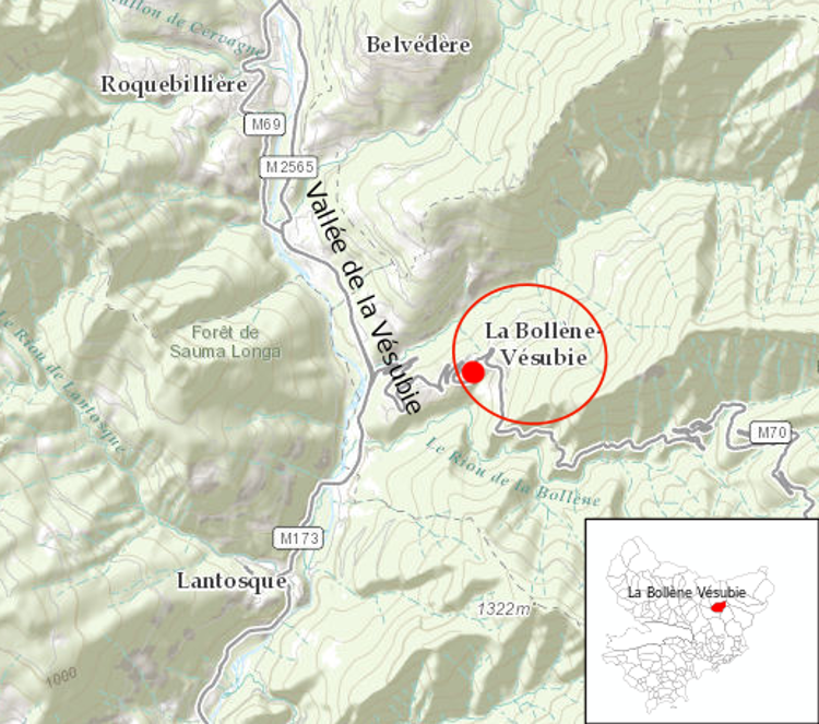 Le village de la Bollène Vésubie est situé dans la vallée de la Vésubie, à quelques 55 km du littoral. Le village est perché sur un replat à 700 m d’altitude, surplombant en rive gauche, la vallée où coule la rivière Vésubie. Il est traversé par la RM 70 qui relie par le célèbre col de Turini (alt. 1 607 m), les vallées de la Vésubie et de la Bévéra à l’Est. Sur le plan touristique, La Bollène est une porte d’accès au Parc National du Mercantour, sans oublier bien sûr, la proximité avec la vallée des Merveilles.
