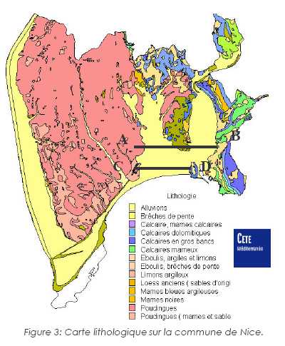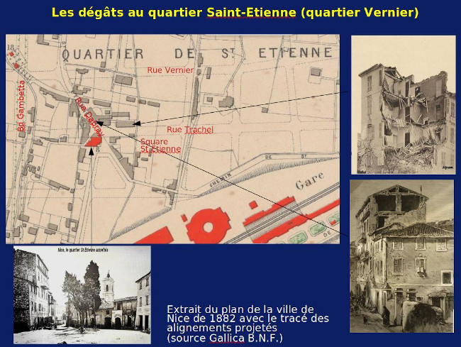 Lors du tremblement de terre, ce sont surtout les quartiers de Saint-Etienne (actuellement Vernier), Thiers, rue de France, l’avenue de la Gare (actuellement Bd Jean Médecin), les rues adjacentes, constituant la nouvelle ville, qui ont le plus souffert. Avec le rattachement du Comté de Nice à la France en 1860 et la mise en service de la Gare Nice-Ville en 1865, l’ensemble de ces quartiers ont connu un développement fulgurant. Ils se sont principalement développés sur un bassin de remplissage sédimentaire constitué par des dépôts provenant du Paillon et des nombreux vallons descendant des collines.
