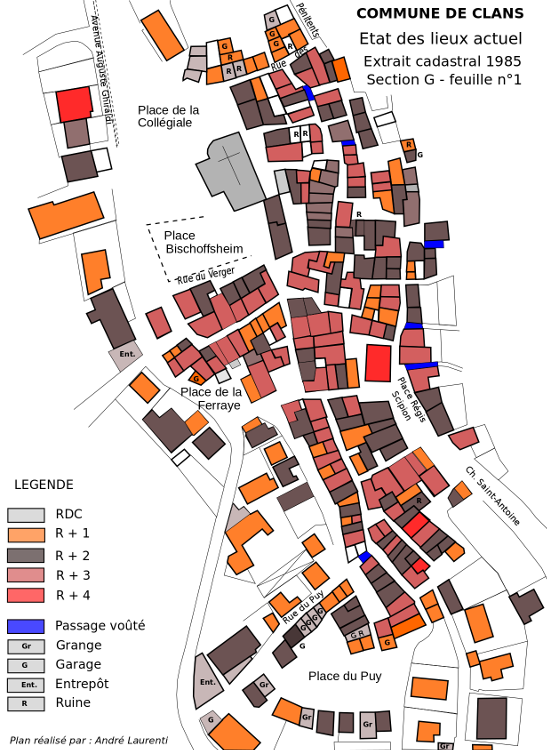 Mise à part les galétas qui ont pour la plupart été rendus aujourd’hui habitables, le bâti de Clans n’a pas trop changé. En comparant les parcelles qualifié de totalement détruites et la situation actuelle, on constate qu’il s’agit de bâtiment comportant 1 à 4 étages comme le montre le tableau ci-dessous.