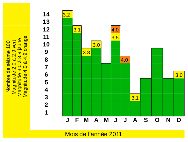 Ainsi l’année 2011 a connu 91 séismes de magnitude supérieure ou égale à 2.0 - 7 séismes de magnitude supérieure ou égale à 3.0 et 2 séismes de magnitude supérieure ou égale à 4.0 soit au total 100 séismes.