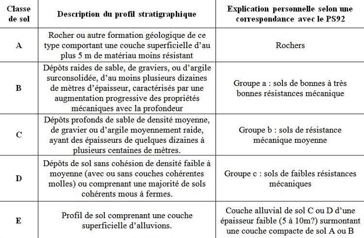Avec le zonage sismique, l’étude de sol doit aussi fournir la catégorie de sol du terrain en fonction des données mécaniques et géologiques obtenues après investigations. Dans la nouvelle norme, les sols sont regroupés en 5 catégories de A à E dont le détail est donné dans le tableau ci-dessous.