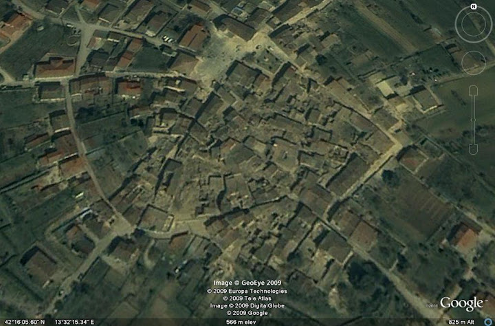 Villa Sant’Angelo (431 habitants) situé en plaine, nombreux bâtiments endommagés, quelques un d’effondrés, on compte 17 morts. Voici une vue aérienne avant le séisme et après. Voir également pour ce village les photos suivantes : 2 - 3 - 4 - 6