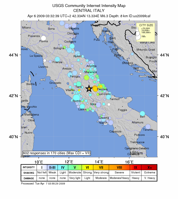 Un tremblement de terre d’une magnitude locale de 6.3 (Ml), selon le Réseau National de Surveillance Sismique de Strasbourg (ReNaSS), de magnitude du moment 6.2 (Mw) selon "l’Istituto Nazionale di Geofisica e Vulcanologia" (INGV), s’est produit à 01 h 32 TU soit à 03 h 32 heure locale lundi 06 avril 2009. L’épicentre est très proche d’une zone habitée notamment de l’Aquila une ville de 72 222 habitants, chef-lieu de la province du même nom, dans la région des Abruzzes. L’Aquila se trouve à 721 m d’altitude près du plus haut sommet des Apennins le Gran Sasso. Le foyer du séisme qui semble être très superficiel a été estimé selon l’INGV à 8,8 km de profondeur seulement, donc très proche de la surface, ce qui explique l’importance des dégâts, mais sur une étendue limitée.