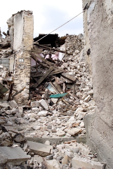 En février 2010, dix mois après le tremblement de terre, des tonnes de gravats obstruent toujours les rues de l’Aquila empêchant le retour de ses habitants dans le centre historique, devenu une véritable ville morte.