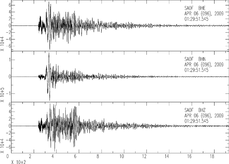 Avant le grand choc, deux événements ont eu lieu avec une secousse de magnitude locale de 4.0 le 5 avril 2009 à 20 h 48 TU soit à 22 h 48. La seconde de magnitude 3.5 a eu lieu à 22 h 39 TU soit 3 heures environ avant le choc principal.