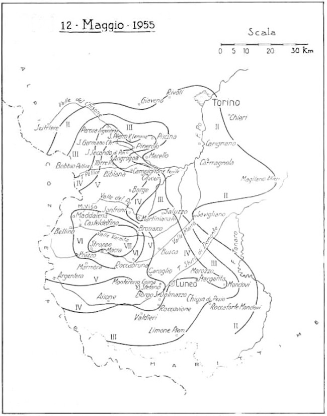 Le 12 mai 1955 à 15 h 16’ (heure locale), une forte secousse affecta la province de Cuneo dans une zone située entre les vallées de la Maïra et de la Varaïta.