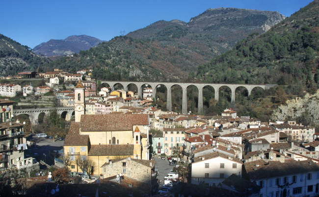 Le château de Saorge ruiné avec le pont de Roccatagliata où était le chemin du Piémont.