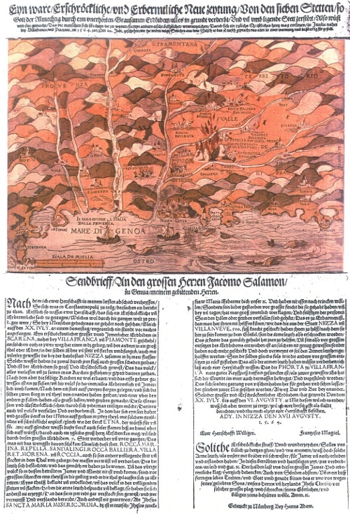 Un autre document remarquable, contemporain à ce tremblement de terre, est une lettre publiée en allemand et illustrée d’une carte. Il représente l’une des plus importantes sources de ce séisme et a servi de référence de base à la plupart des historiens et des sismologues qui ont étudié cet événement.