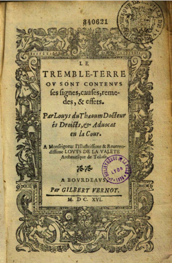 [1] Le tremble-terre ou sont contenus les signes, causes, remèdes et effets – Louys du Thaoum Docteur és Droits et Advocat en la Cour – Gilbert Vernoy – Bordeau – 1616 – pages 197 à 199
