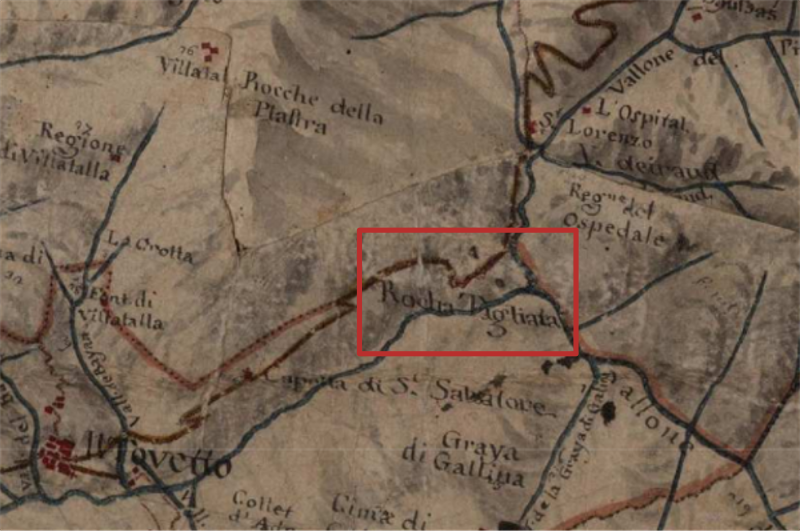 Quant à la suite du texte, il faut comprendre l’effondrement d’un pont au droit du Mont-Taillat. Il existait un passage étroit situé sur la voie allant de l’Escarène à Sospel via le col de Braus, appelé "Rocca Tagliata". Cette dénomination a disparu des cartes actuelles, mais elle figure sur cette carte des Archives Royales de Turin. Il existe deux anciens ponts proches de "Rocca Tagliata". Le premier se situe au hameau de Saint-Laurent et le second sur le vallon du Mont Auri qui a pu faire parti de l’ancienne voie.