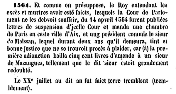 Jean Vogt, père de la sismicité historique en France, découvrit à la bibliothèque de Carpentras, un témoignage aixois à propos de ce séisme de 1564. La chronique de Foulquet Sobolis (1562-1607), histoire de la Provence en forme de journal durant la période de 1562 à 1607, publié par le docteur F. Chavernac (août 1894). L’auteur note dans son journal, ce jour "au dit an fut faict terre tremblant". Tout porte à croire que l’événement fut ressenti jusqu’à Aix en Provence [12].